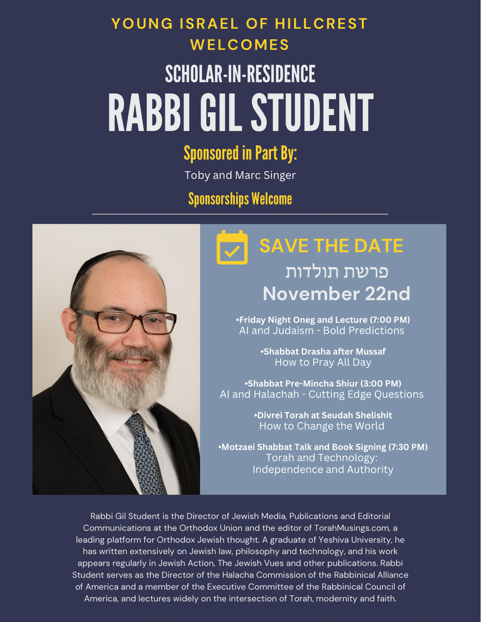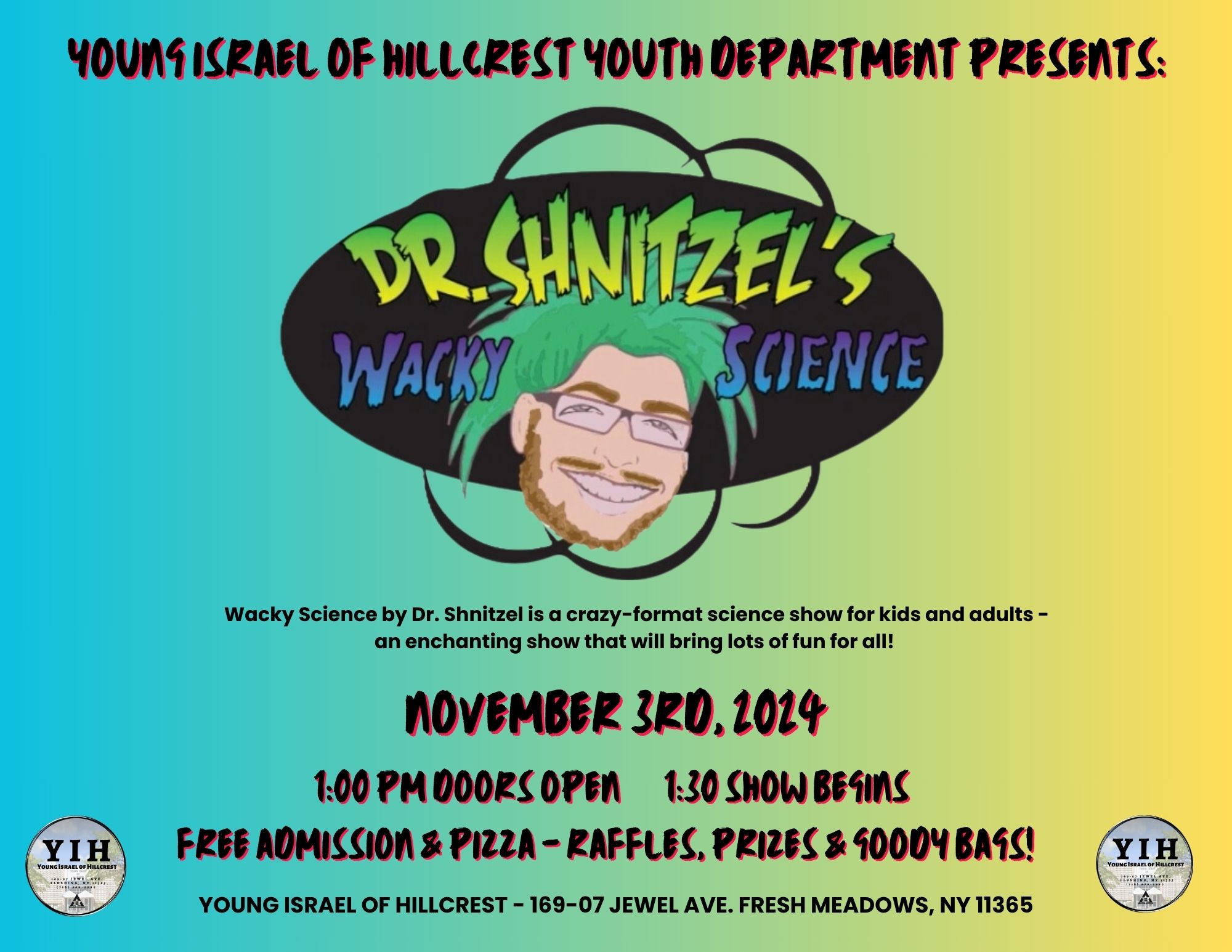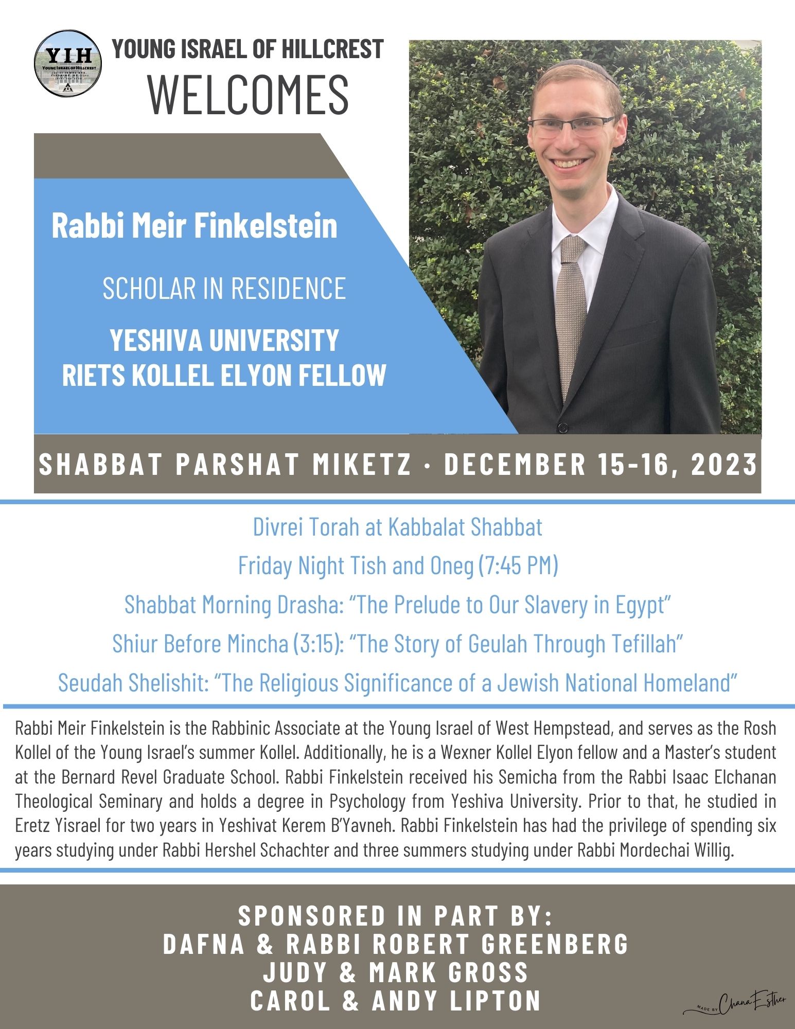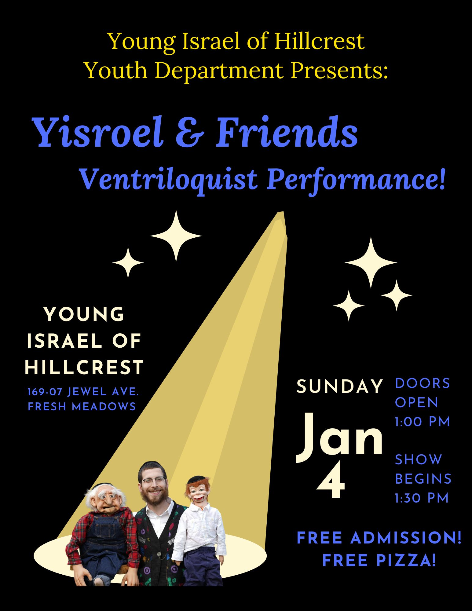 Photos/Events Yisroel & Friends Ventriloquist 1/4/2026 View Flyer View Pictures Sivan's Kitchen 12/9/2025 View Flyer Scholar in Residence Rabbi Gil Sudent 11/22/2025 View Flyer Puppet Theater Show 10/26/2025 View Flyer View Pictures What is a Rabbi -Cop 8/25/2025 View Flyer Rabbi Pesach Krohn 8/24/2025 View Flyer Rabbi Meir Soloveichik 6/7/2025 View Flyer Cake Bake Remix 5/5/2025 View Flyer View Pictures playing for our land 1/11/2025 View Flyer Magic Show - 3/2/2025 View Flyer View Pictures by Yankee Goldstein Learning For Our Land 6/9/2025 View Flyer View Pictures by Yankee Goldstein Nick the Balloonatic 1/12/2025 View Flyer View Pictures by Yankee Goldstein Mosaic Crafts Project 3/18/2025 View Flyer View Pictures by Marilyn Herman BOOTS FOR ISRAEL - 3/30/2025 View Flyer View Pictures by Yankee Goldstein Women's Tisch 7/27/2024 View Flyer Cake Decorating 6/5/2024 View Flyer Dr. Shnitzel's Wacky Science 11/3/2024 View Flyer Wine tasting 3/9/2024 View Flyer Heroes of Zaka 2/12/2024 View Flyer Assito Kanko 1/15/2024 View Flyer Siyum and Memorial for Victims of Oct 7th and Current War in Israel 10/6/2024 View Flyer Listen to recording Shabbos Kestenbaum Suing Harvard over Antisemitism 9/22/2024 View Flyer Listen to recording Uri Kaufman lecture on the Yom Kippur War and October 7th 9/8/2024 View Photos Listen to recording The Power of Women 7/21/24 View Photos Pre-Purim Extravaganza 3/3/2024 View Photos Playing For Our Land 2/10/2024 View Photos Tu B'Shvat Fruit Carving Demo 2/5/2023 View Photos The Parrot Rebbe 11/5/2023 View Photos Learning for Our Land 12/23/2023 View Photos Veterans Day Program 11/26/2023 View Flyer Scholar in Residence Michal Horowitz 10/27/2023 View Flyer Scholar in Residence Rabbi Meir Finkelstein 10/27/2023 View Flyer Chanukah Party 12/18/2022 View Photos Purim Laser Light & Music Show View Photos Avos U'Banim View Photos Rabbi Schnall's YU Talmidim Shabbaton Heart to Heart Jewelry Making November 2023 View Flyer Veteran's Day Program 11/26/2023 View Flyer Rabbi Schnall's Installation Listen to Recording Rabbi Simcha Krauss Memorial Event listen to Recording Tribute Recording Listen to Recording