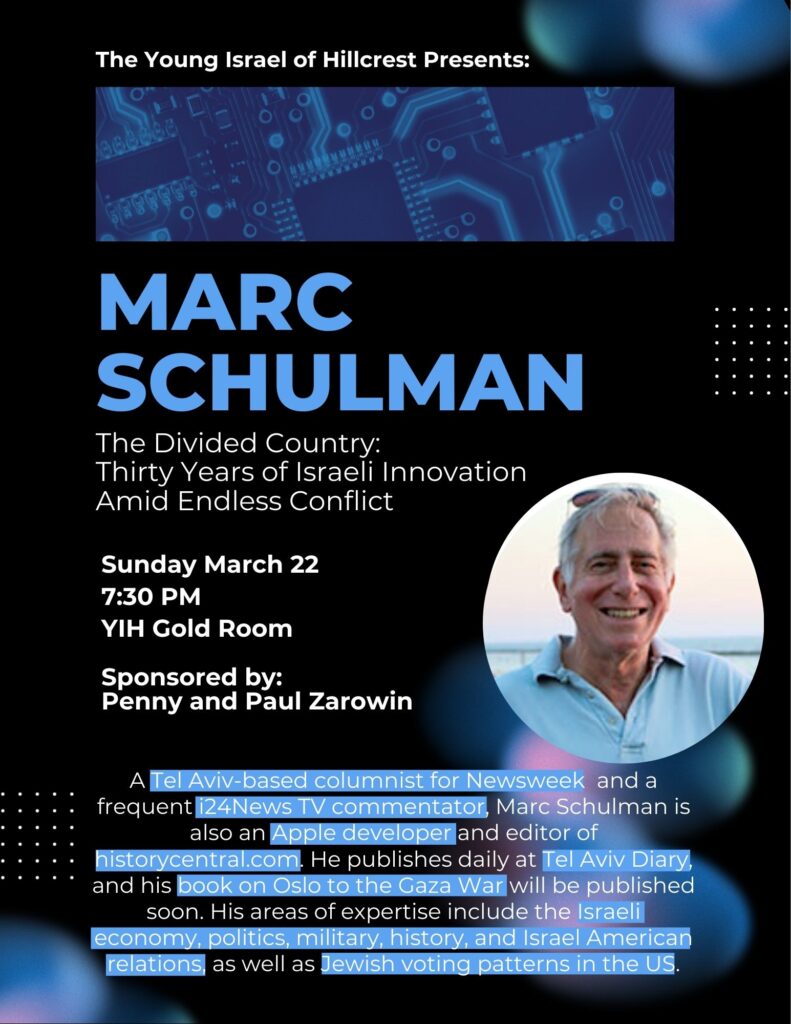 Marc Schulman on the Divided Country: 30 years of Israeli Innovation Amid Endless Conflict, Sunday, March 22, 2026 / Uncategorized / By Susan Bernstein